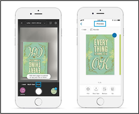 Při skenování z pracovní plochy skeneru tiskárny HP+ nebo fotoaparátu mobilního zařízení je v aplikaci k dispozici skenování knih